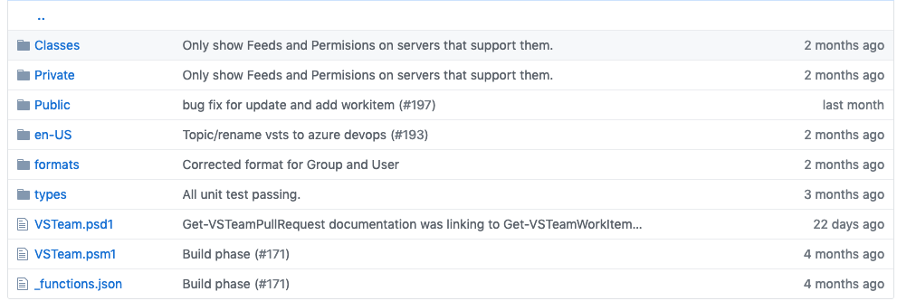 And there was, and it wasn’t that hard. In fact, all we needed to do was break code down and begin adding some unit tests as we went. My inspiration came from looking though Donovan Brown’s excellent PowerShell module for accessing VSTS, VSTeam. Being curious by nature, I wanted to get some understanding of how the module working and one of the first things that struck me was how the project was structured.