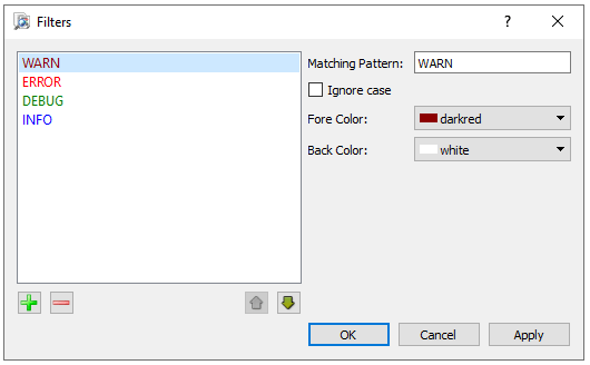 Another feature I configure almost immediately when I’m setting up the tool is ‘filters’, this feature gives you the ability to highlight individual log lines that match a search criterion with a chosen fore and back colour. From the screen shot below I’ve set up a several fairly generic filters that give me a quick way of scanning though a file for the log type I’m after. You can also see this highlighting in action in the first screenshot.